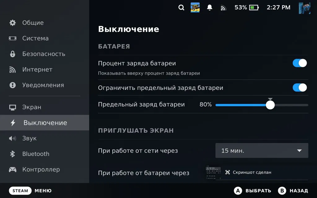 - Добавлена функция ограничения заряда аккумулятора в разделе Настройки > Выключение: