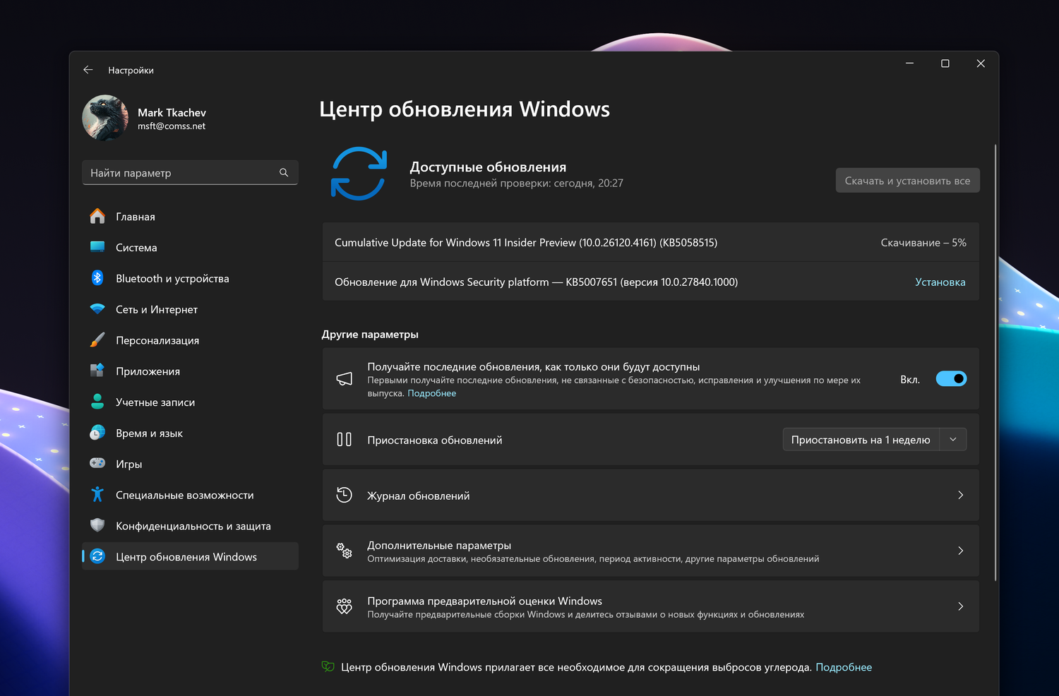 Перейдите в меню Параметры > Центр обновления Windows и нажмите Проверить наличие обновлений. Для завершения установки потребуется перезагрузка компьютера.