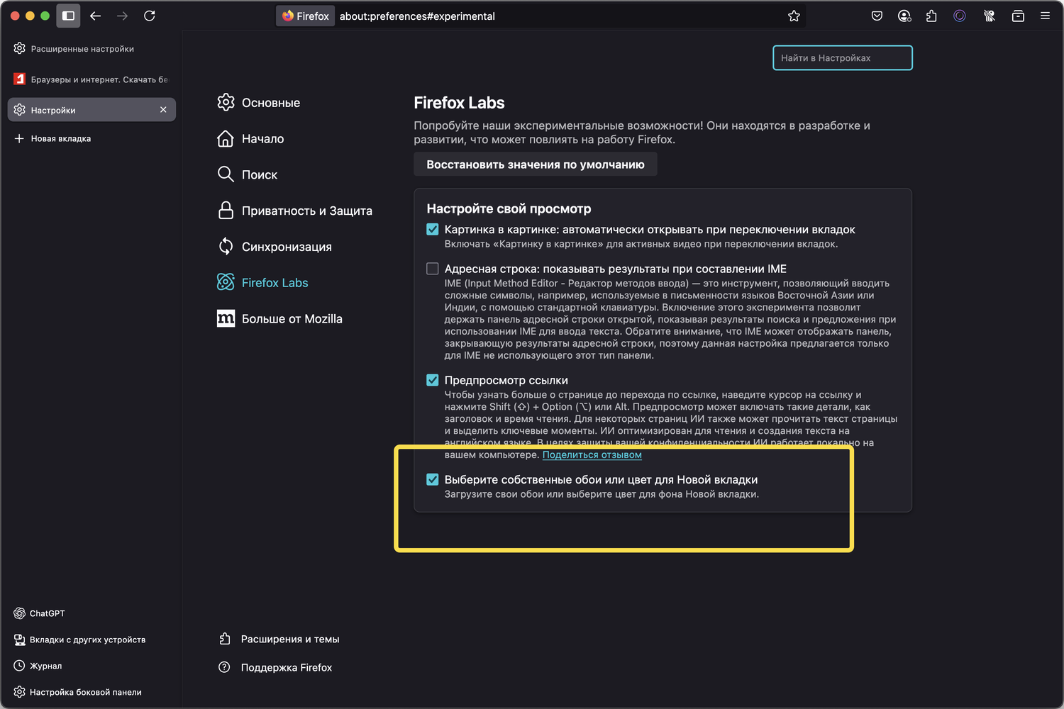 Функция будет развертываться со временем, но вы можете включить ее сразу в Firefox Labs. Это делается путем перехода на страницу about:preferences#experimental в адресной строке Firefox и установки флажка Выберите собственные обои или цвет для Новой вкладки.