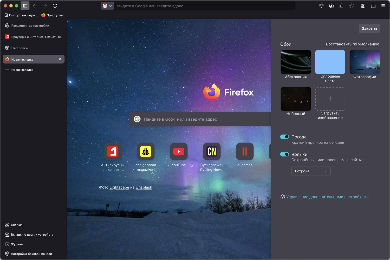 Главное дополнение — возможность загружать любое изображение, чтобы установить его в качестве обоев на странице новой вкладки.