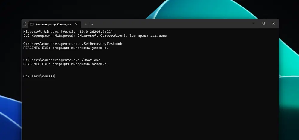 - Перезагрузите компьютер. Устройство загрузится в Windows RE и симулирует процесс восстановления.