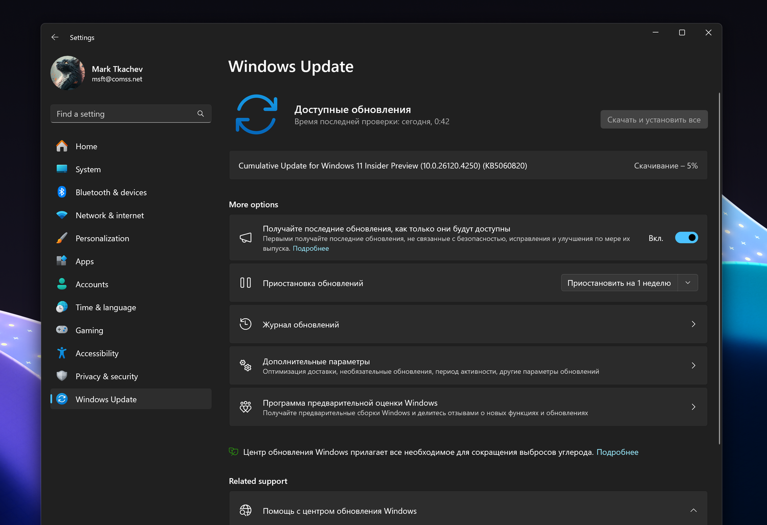 Примечание. Microsoft заблокировала установку обновлений для инсайдеров Windows 11 в России и Беларуси. Для установки обновления KB5060820 (Build 26120.4250) вы можете использовать наши DNS-серверы: Установка инсайдерских сборок Windows 11 с помощью Comss.one DNS.