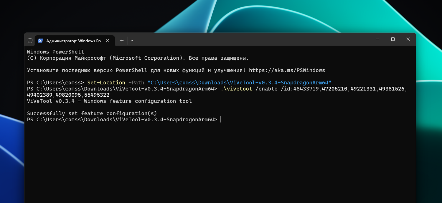 Примечание: В примерах используются команды в Терминале для профиля PowerShell. Если вы используете профиль Командная строка, замените начальную команду .\vivetool на vivetool.