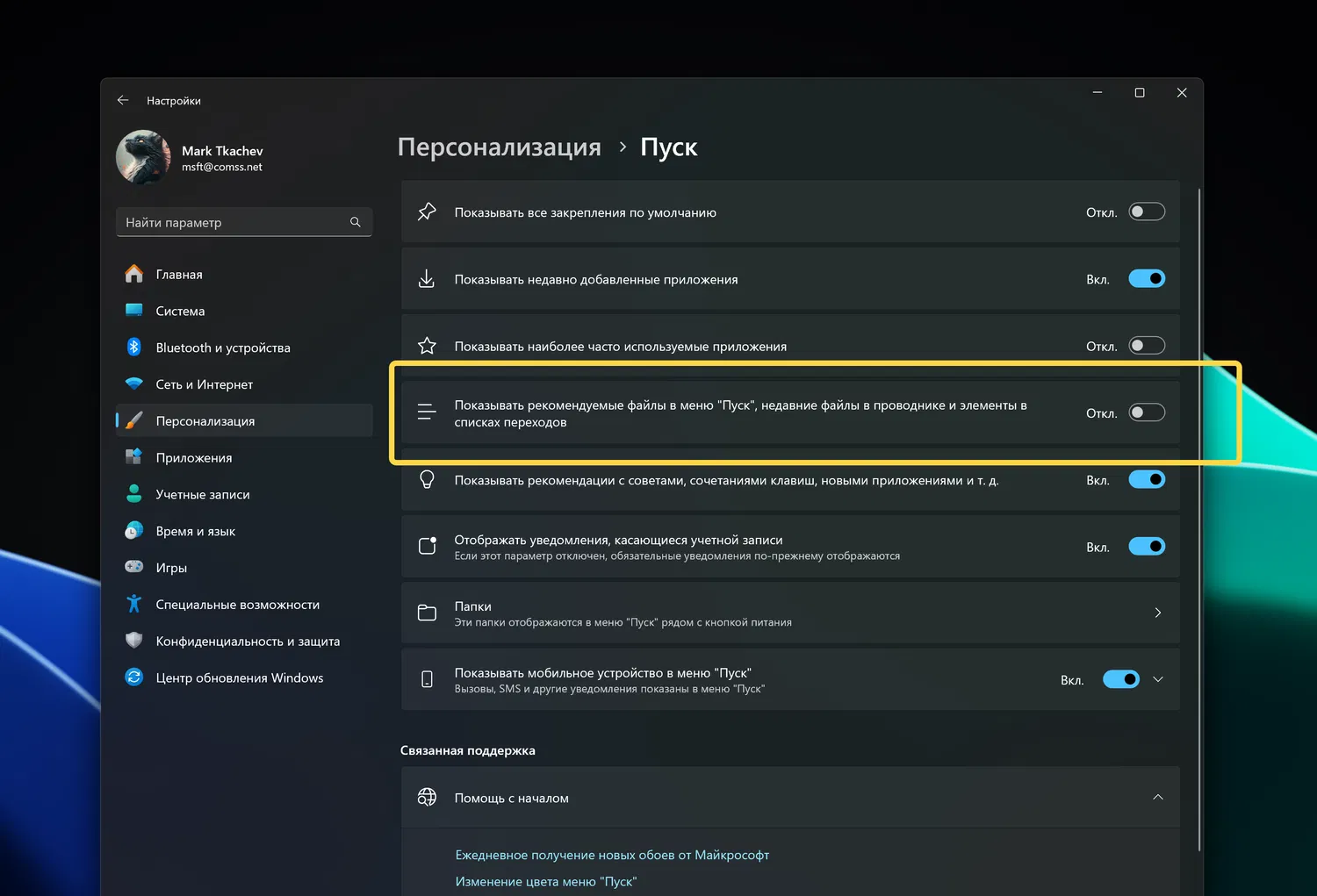 В разделе настроек Параметры > Персонализация > Пуск можно отключить опцию Показывать рекомендуемые файлы в меню "Пуск", недавние файлы в проводнике и элементы в списках переходов