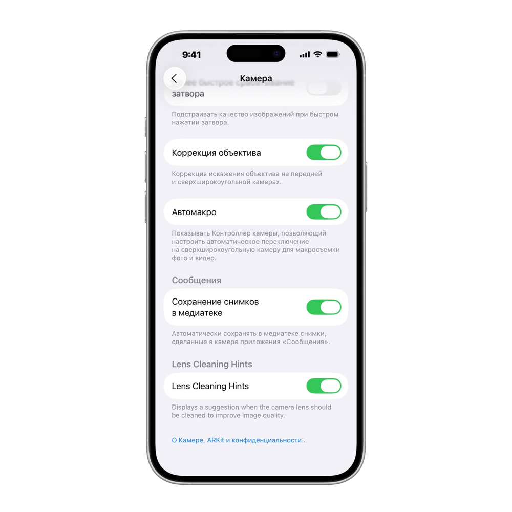 - Советы по очистке камеры. В настройках «Камера» появился переключатель «Lens Cleaning Hints» (Советы по очистке линз). При его включении система будет показывать уведомление, когда объективы iPhone нужно протереть для лучшего качества фото. Эта функция пока работает на iPhone 15 Pro и новее (и учитывает даже «ожог» от лазера, предлагая чистку).