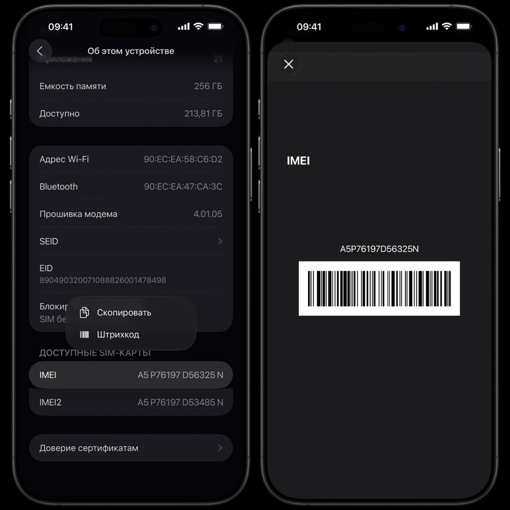 - Штрихкод IMEI. В iOS 26 в «Настройки» > «Об устройстве» при долгом удержании по полю IMEI теперь появляется штрихкод номера (в виде экранной картинки), который можно сканировать, например, складским сканером.