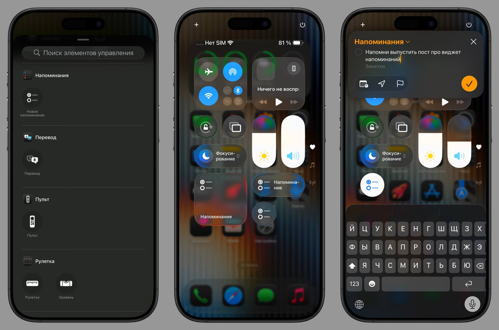 - Новый виджет «Напоминания». В Центре управления iOS 26 доступен новый виджет для быстрого добавления напоминаний. Его можно добавить в Центр управления и сразу создавать напоминания из любого экрана iPhone.