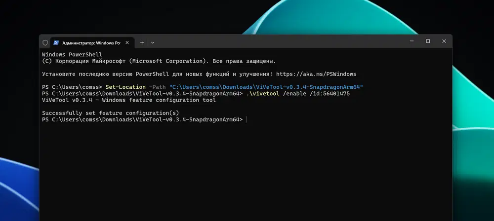 Примечание: В примерах используются команды в Терминале для профиля PowerShell. Если вы используете профиль Командная строка, замените начальную команду .\vivetool на vivetool.