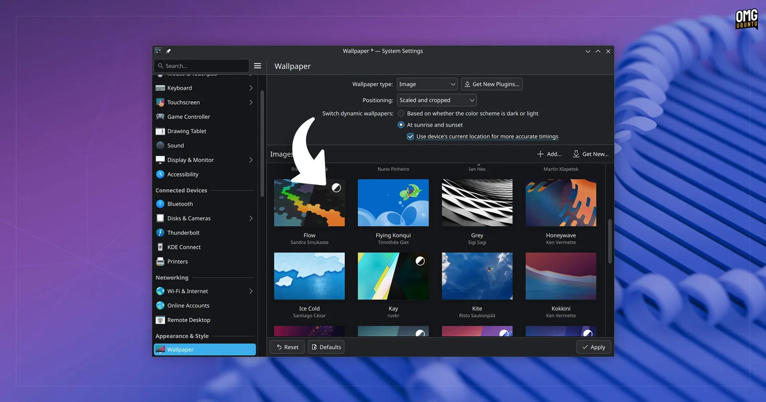KDE Plasma 6.4 добавляет поддержку динамических обоев, которые автоматически переключаются между светлой и тёмной версиями в зависимости от времени суток. В выборе фона такие обои отмечены специальным значком и разделённым предварительным просмотром.