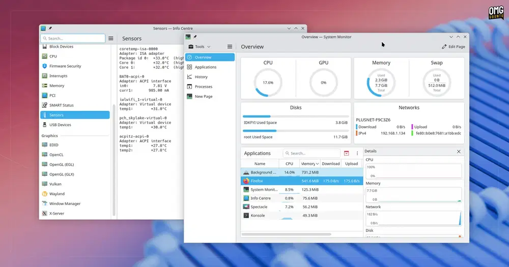 В разделе Информация о системе улучшено отображение ошибок загрузки страниц, использует системный моноширинный шрифт и применяет акцентный цвет системы в графике энергопотребления. Новая страница Sensors отображает данные с датчиков, если установлен lm-sensors. Системный монитор выделяет ключевые показатели, такие как использование GPU, группирует фоновые службы и добавляет два типа графиков ЦП.