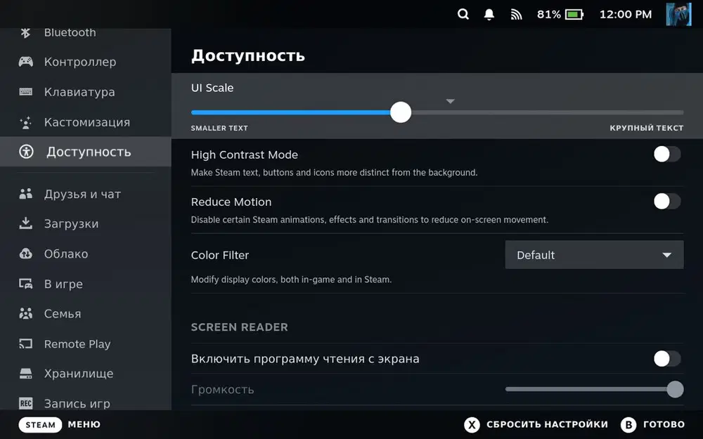 Те же функции теперь включены и в последнюю бета-версию SteamOS 3.7.10, где режим Big Picture также является основным интерфейсом. Таким образом, улучшения в масштабировании, контрастности и поддержке экранного диктора становятся доступны и владельцам Steam Deck и других портативных устройств под управлением SteamOS.