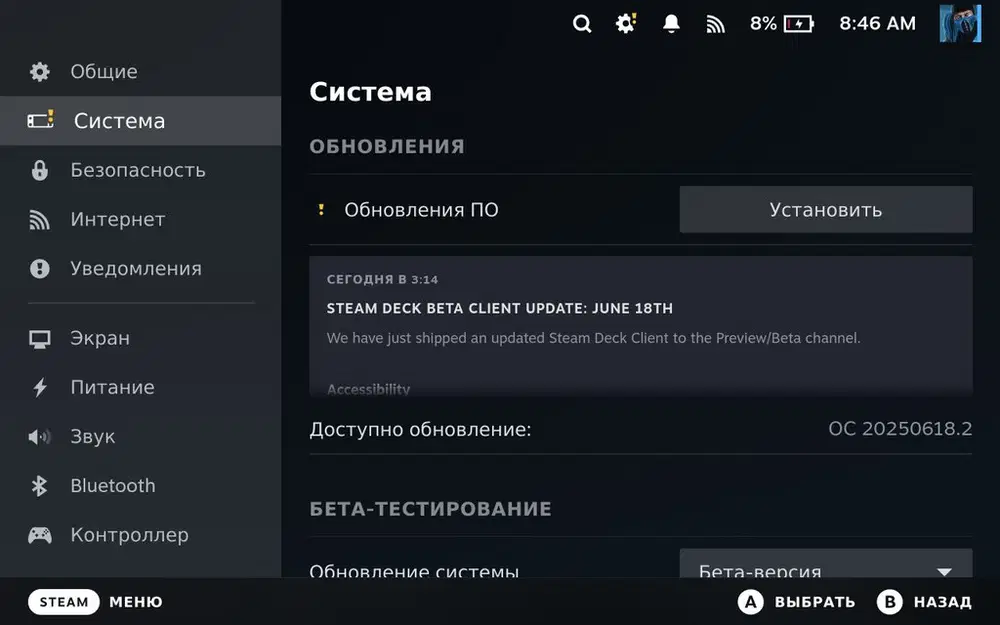 - В выпадающем меню «Обновление клиента Steam» выберите пункт Steam Deck Beta.