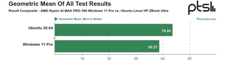 В сравнении Ubuntu 25.04 и Windows 11 Pro на ноутбуке HP ZBook Ultra G1a с новым процессором AMD Ryzen AI Max PRO 390 Linux одержал победу в 66% тестов. Средний прирост производительности составил 13% в пользу Ubuntu, особенно в вычислительных задачах. Windows оказалась чуть лучше в графике благодаря оптимизированным драйверам. Это подтверждает, что Linux — мощная альтернатива для профессиональных задач, требующих высокой производительности.