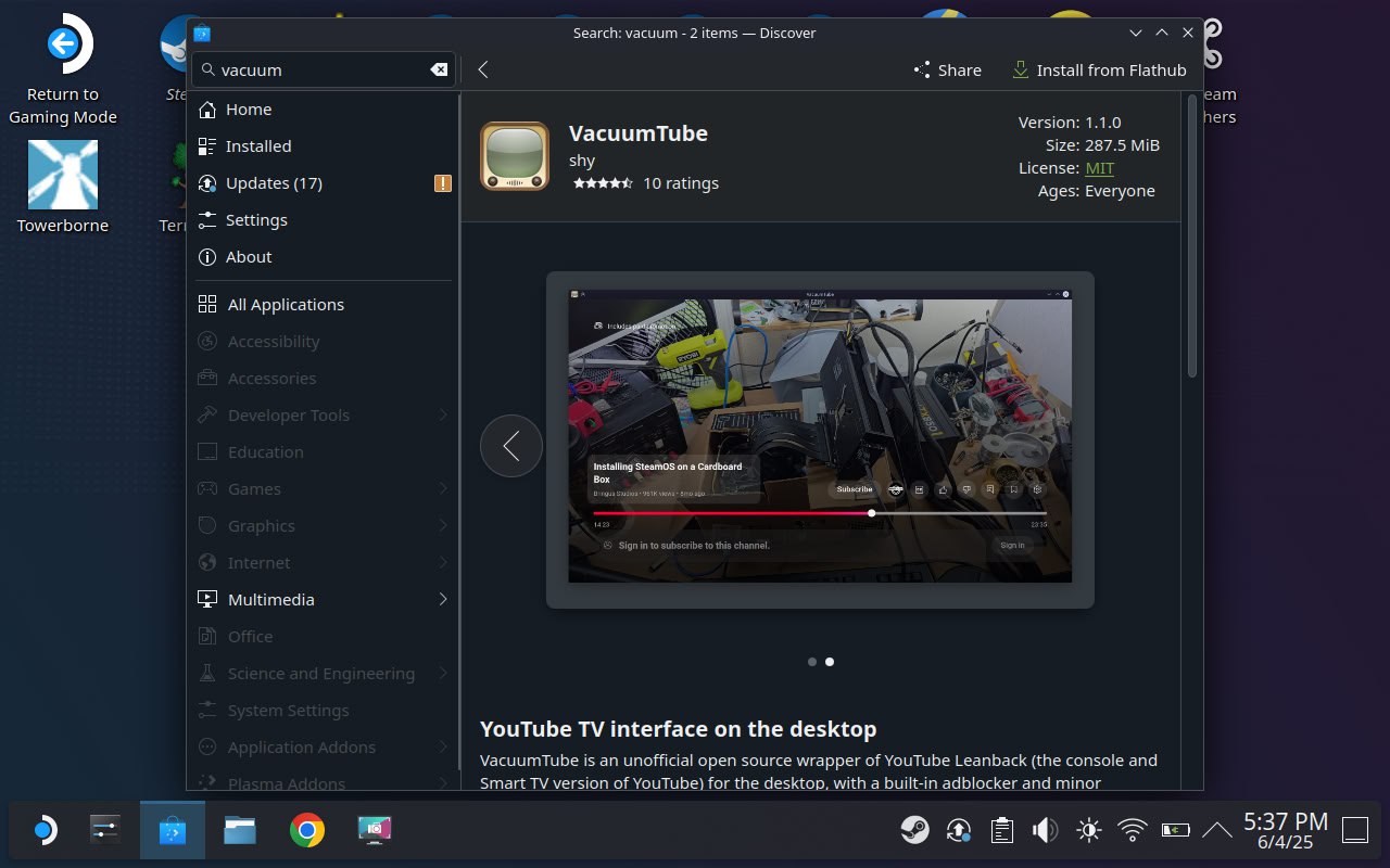 VacuumTube — неофициальное приложение, превращающее Steam Deck в полноценный YouTube-терминал. Оно использует интерфейс Leanback от Google, встроенный блокировщик рекламы и полностью совместимо с геймпадом. Приложение с открытым исходным кодом доступно на Flathub и позволяет наслаждаться видео без лишних хлопот, прямо в игровом режиме. Идеально для медиацентров на базе SteamOS.