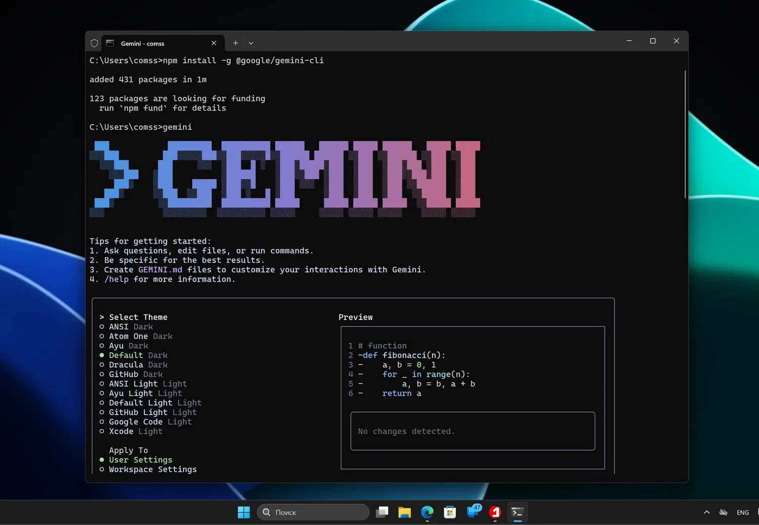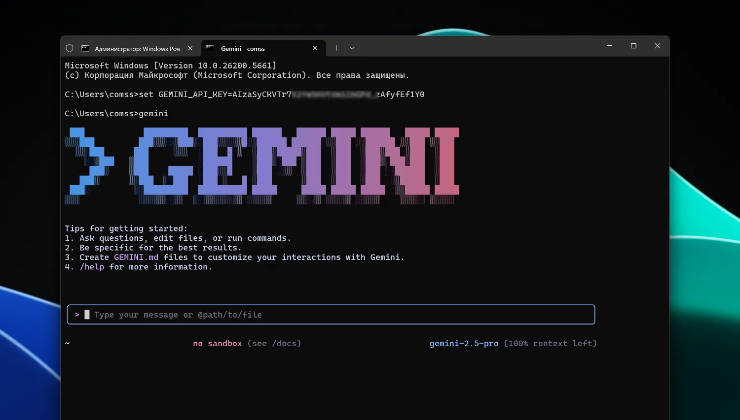 Запуск Gemini CLI: Выполните следующую команду в терминале: