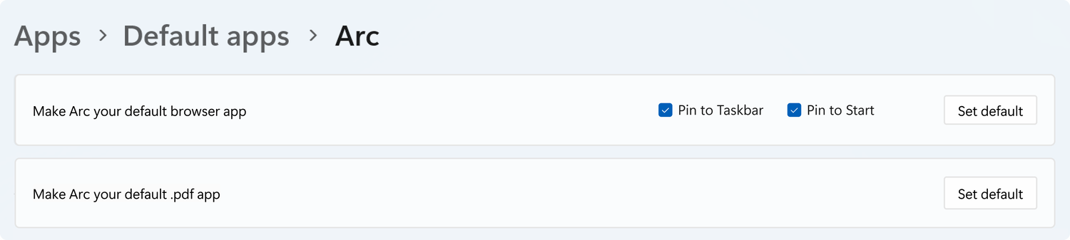 - Если выбрать другой браузер в разделе Параметры > Приложения > Приложения по умолчанию, он будет закреплён на панели задач и в меню «Пуск», если пользователь не снимет соответствующие флажки.