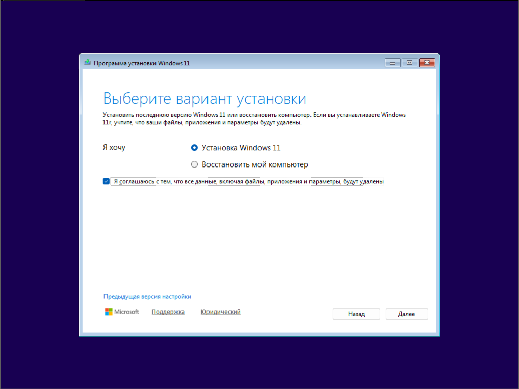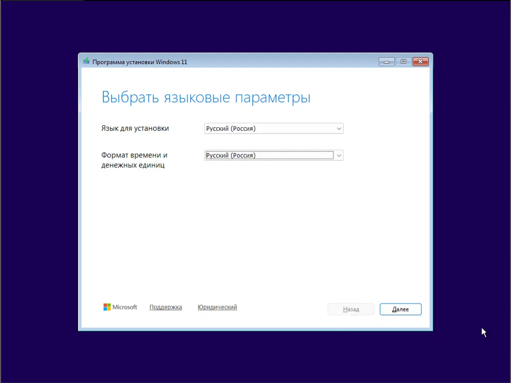 Ниже показан процесс установки с помощью ISO-образа Windows 11 с обходом ограничений в виде процессора, TPM 2.0, Secure Boot и UEFI. Поэтому используется установщик от Windows Server, при этом будет установлена представленная на этой странице сборка Windows 11, версия 25H2.