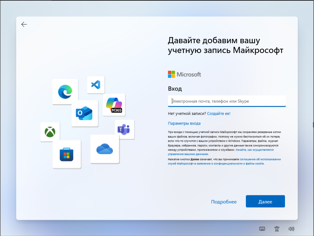 После установки вы можете настроить систему по своему вкусу, включая параметры конфиденциальности, аккаунт Microsoft и настройки облачных служб.