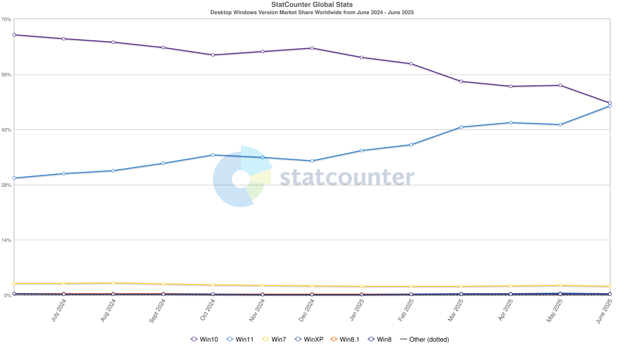 В июне 2025 года произошел один из самых крупных скачков доли Windows 11 в истории — с 43,22% до 47,98%. Такой большой рост ранее уже случался однажды спустя несколько месяцев после релиза. В январе 2022 года доля Windows 11 выросла с 2,6% до 7,89%, т.е. на 5,29 процентных пунктов. Годовой прирост составил 18,23%.