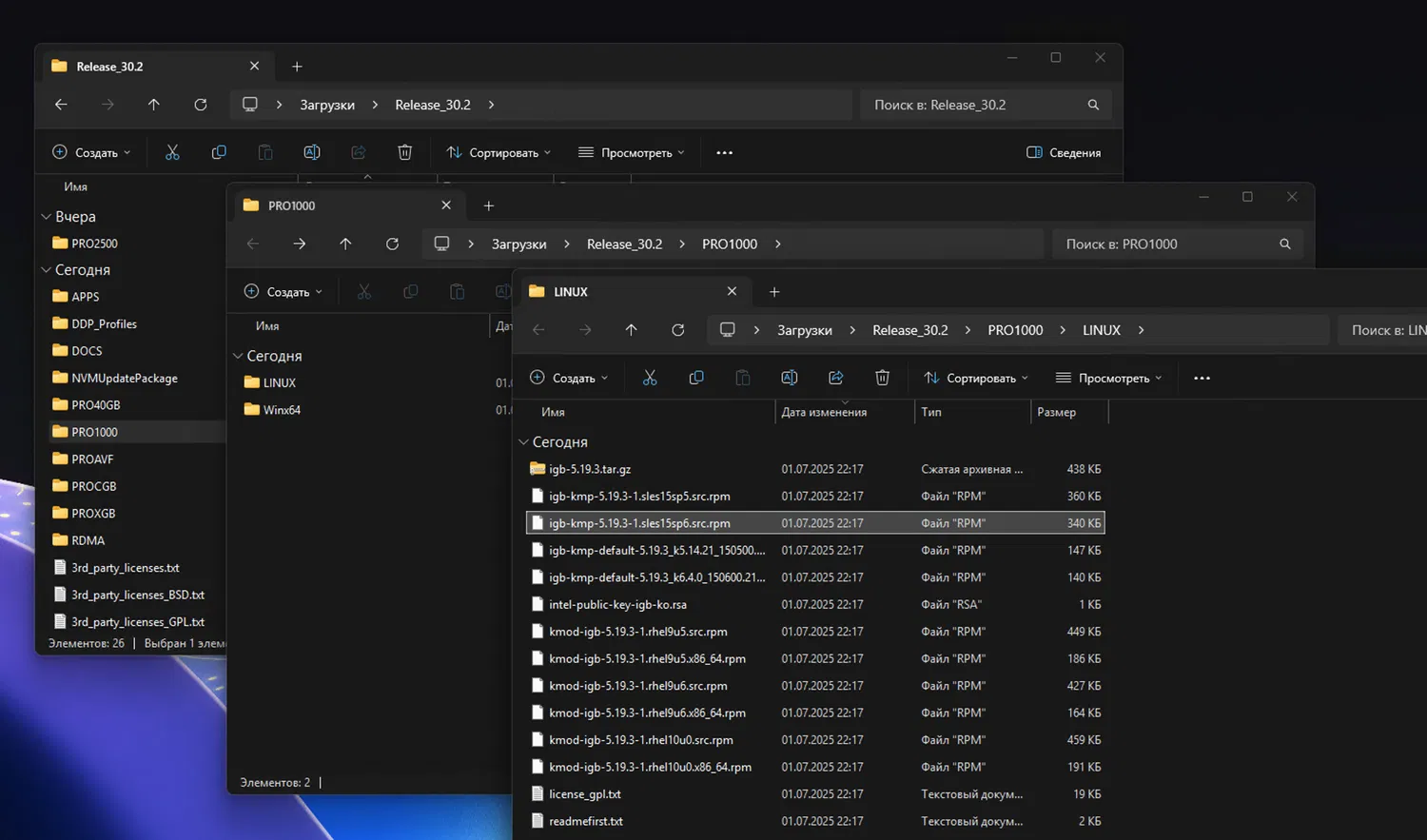 - Драйверы для различных семейств контроллеров (Intel Ethernet Controller I210, I350, X550, E810 и др.).