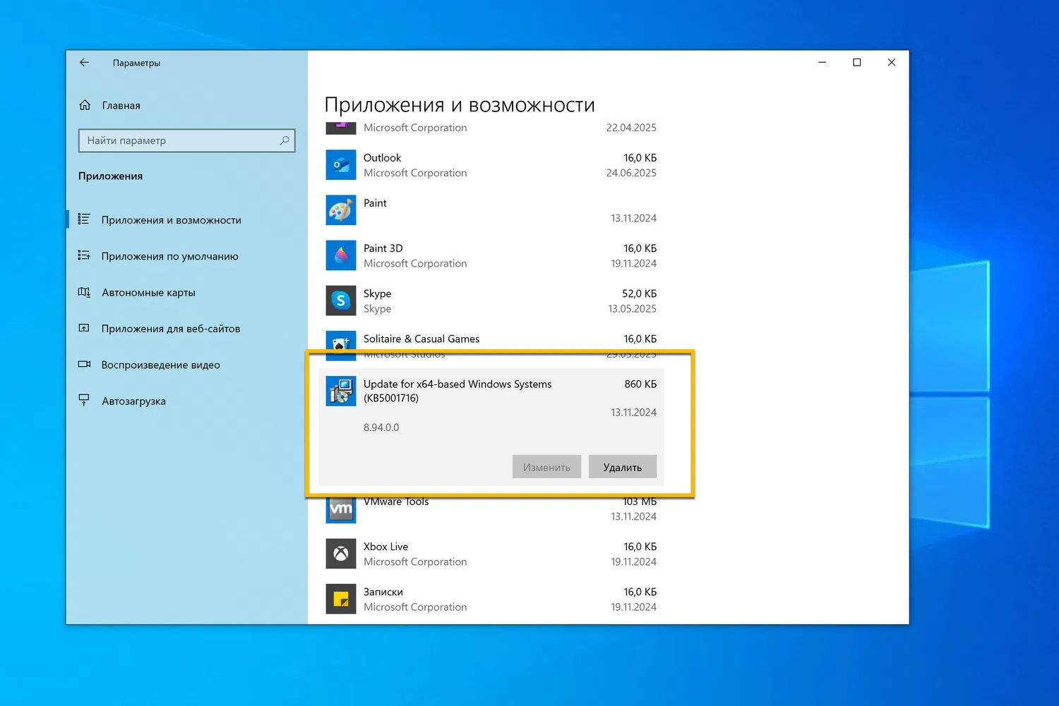 Если вы хотите проверить наличие KB5001716 на своём устройстве, откройте Параметры > Приложения > Приложения и возможности и найдите в списке Update for x64-based Windows Systems (KB5001716).