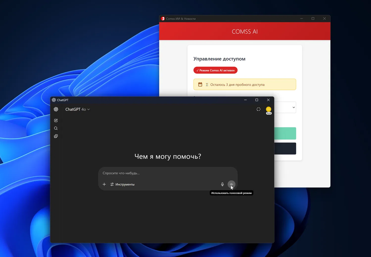 COMSS AI — приложение для Windows, обеспечивающее доступ к ChatGPT, Claude, GitHub Copilot, обновлениям Windows Insider, Avast, Bitdefender и сотням других платформ в России. Поддерживает ИИ, программирование, дизайн и безопасность. Оно заменяет предыдущее решение Comss ИИ & Новости.