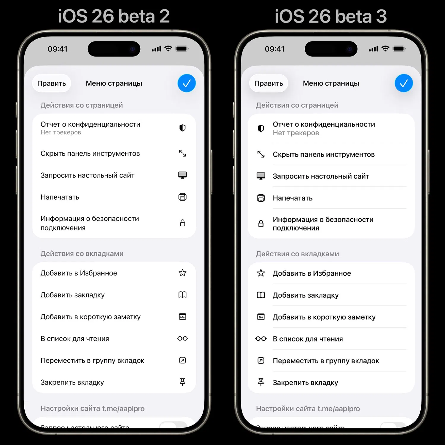 - Liquid Glass — визуальный стиль претерпевает изменения: эффект прозрачного стекла становится менее выраженным. Всё чаще в интерфейсе встречаются элементы с сильным блюром, что делает их более читаемыми, но от первоначального дизайна, показанного на презентации, остаётся всё меньше.
