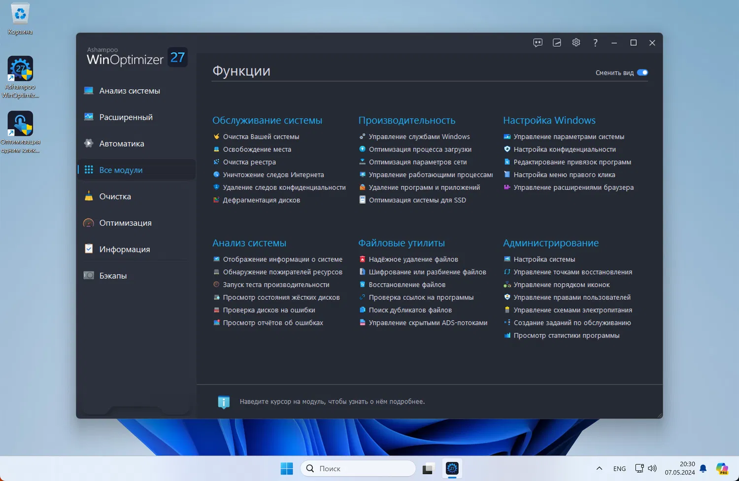 Ashampoo WinOptimizer 27 — это мощный набор инструментов для настройки и ускорения работы Windows, включающий более 30 модулей для очистки, тонкой настройки и анализа системы. Программа помогает освободить место на диске, повысить производительность ПК и защитить личные данные.