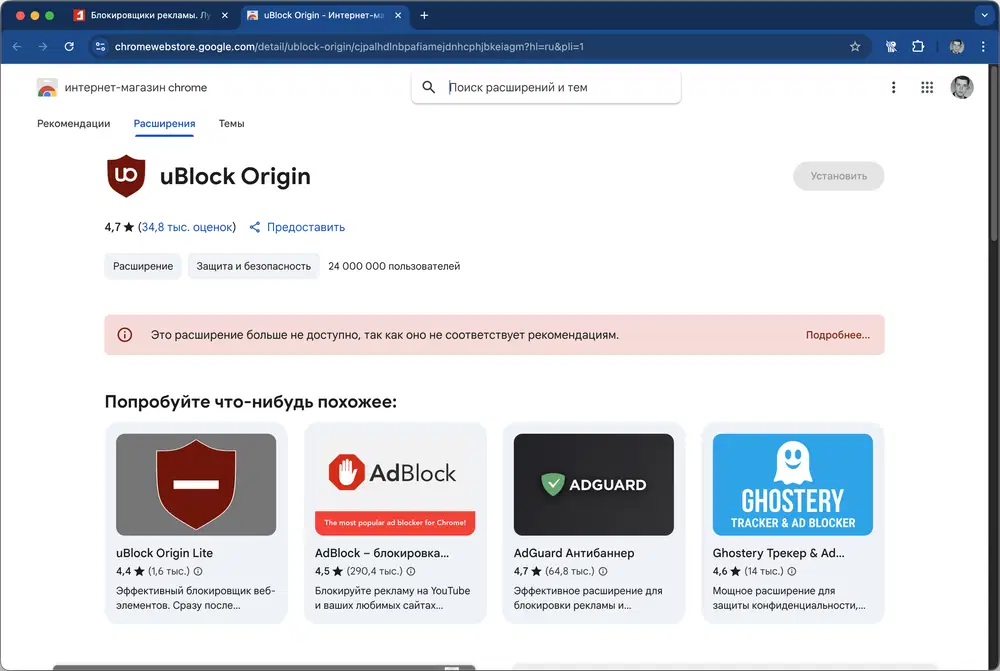 Если Google отключил uBlock Origin и вы не можете его снова включить, попробуйте установить uBlock Origin Lite от того же разработчика. В нем сохранены основные функции, за которые ценят оригинальный uBlock Origin, и вы можете даже не заметить разницы. Все зависит от того, как именно вы пользовались расширением.