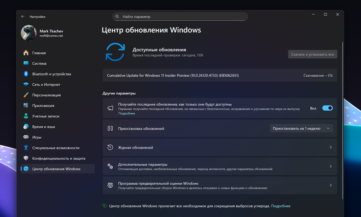 Перейдите в меню Параметры > Центр обновления Windows и нажмите Проверить наличие обновлений. Для завершения установки потребуется перезагрузка компьютера.