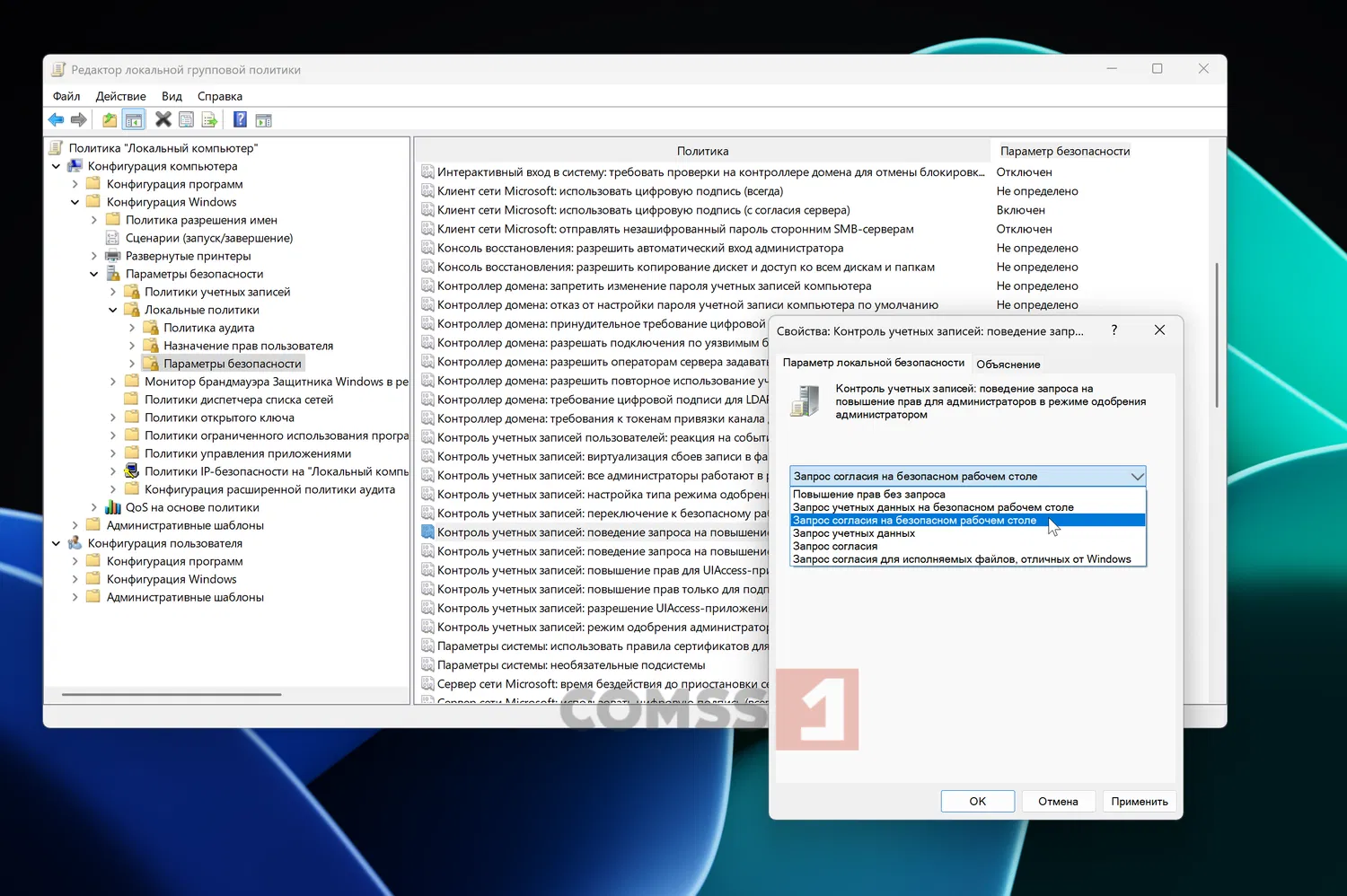 - По умолчанию используется: Запрос согласия для исполняемых файлов, отличных от Windows. Можно изменить на: Запрос согласия на безопасном рабочем столе.