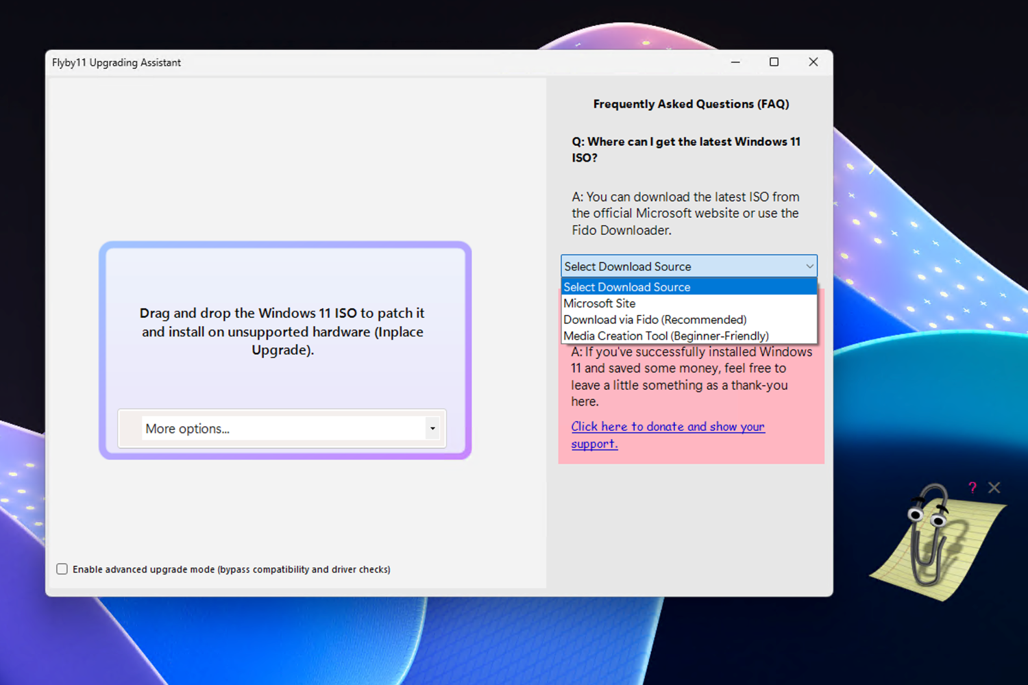 После этого нажмите кнопку «Start Upgrade Now!», чтобы запустить процесс. Откроется основное окно программы. Для обновления понадобится ISO-образ Windows 11 — его можно скачать прямо через FlyBy11. В последней версии добавлена поддержка Media Creation Tool, что может быть удобнее для некоторых пользователей: не нужно вручную выбирать версию Windows при загрузке.