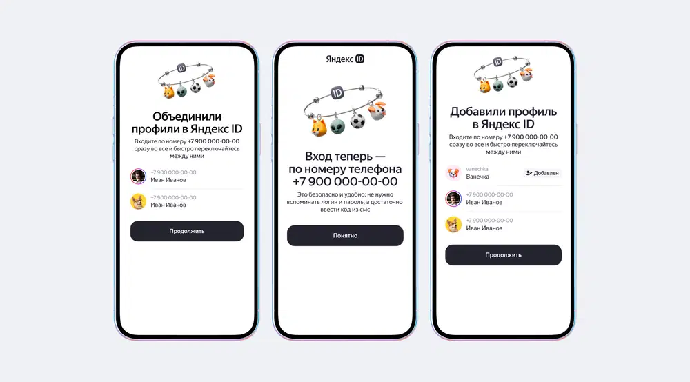 Современный Яндекс ID позволяет объединить личные, рабочие и семейные аккаунты. Пользователи теперь могут в один клик переключаться между аккаунтами, привязанными к одному номеру телефона — без повторного ввода пароля.