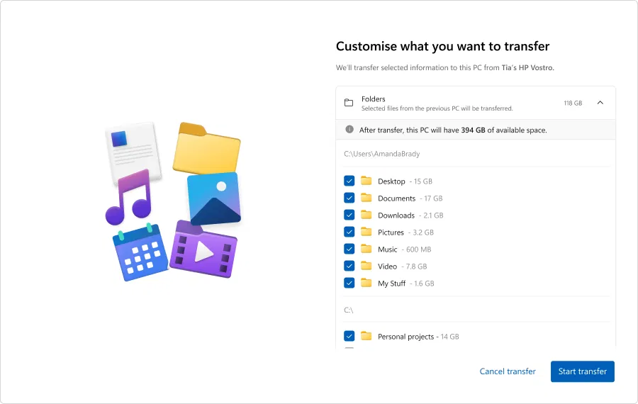 После этого Windows 11 предложит выбрать, какие папки вы хотите перенести. Можно выбрать любые пользовательские папки и даже целые диски (если они зашифрованы с помощью BitLocker, их нужно предварительно расшифровать). Затем нажмите «Начать перенос» — и Windows начнет передавать файлы через сеть.
