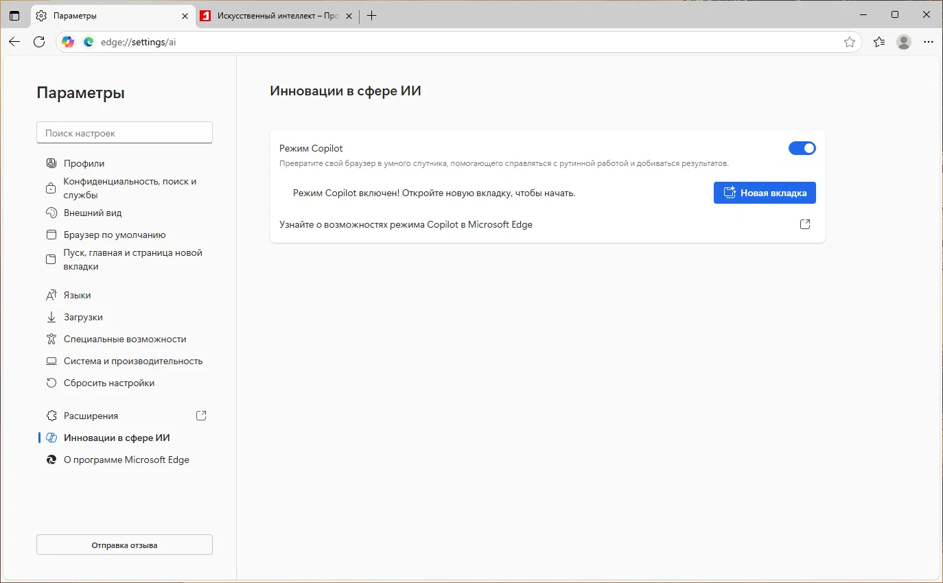 Инновации в сфере ИИ > Режим Copilot или введите в адресной строке edge://settings/ai. Там вы найдёте переключатель для включения и выключения режима Copilot, чтобы вернуть привычный вид браузера.