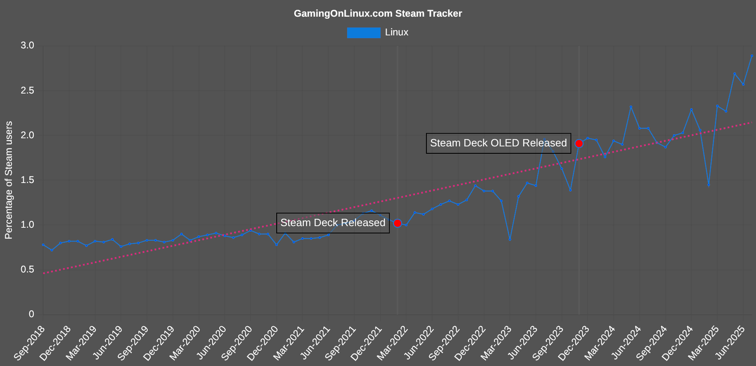 Valve опубликовала результаты опроса об оборудовании и ПО пользователей Steam за июль 2025 года. Основной вывод — доля пользователей Linux продолжает расти и уже почти достигла отметки в 3%.