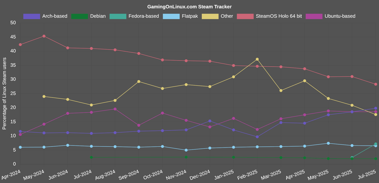 Отдельного внимания заслуживают дистрибутивы Fedora — их рост особенно заметен в июле. Также продолжает укреплять позиции CachyOS, ориентированный на производительность и поддержку игр.