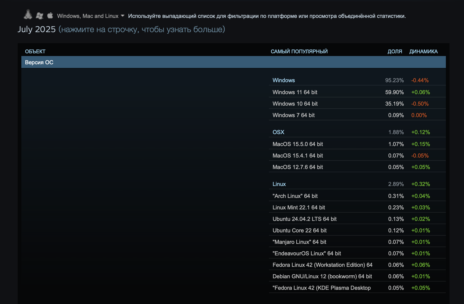 Хотя Linux всё ещё далёк от доминирования в Steam, его доля медленно, но верно растёт. Всё больше игроков выбирают свободную ОС для гейминга, особенно на фоне выхода новых дистрибутивов и стабильной работы Proton и Steam Deck.
