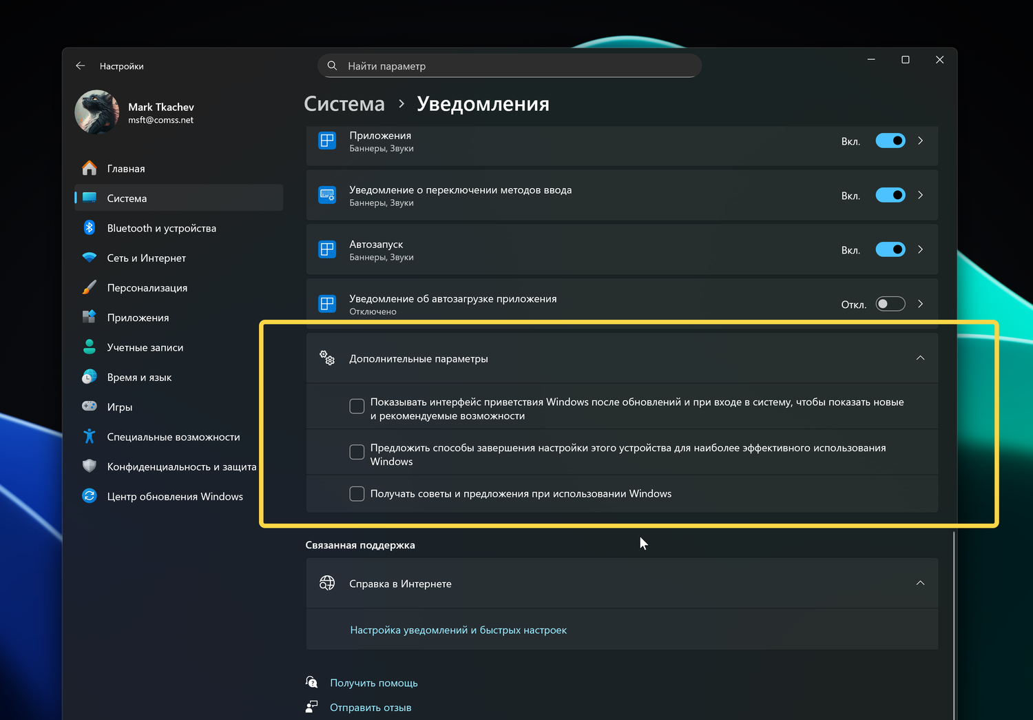 SCOOBE чаще всего появляется на устройствах с локальными учетными записями или при использовании команды oobe\bypassnro. Однако он может показаться и на устройствах с учетной записью Microsoft. Чтобы отключить его, перейдите в приложение Параметры (Настройки) > Система > Уведомления > Дополнительные параметры и отключите все три переключателя: