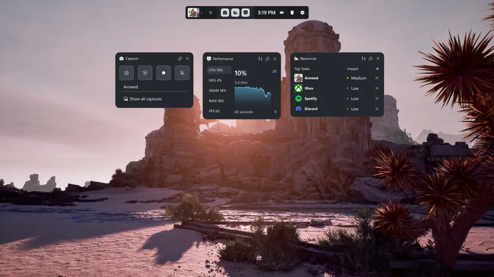 В марте 2025 года Microsoft выпустила обновление для Xbox Game Bar — панели для геймеров, встроенной в Windows. Она позволяет следить за загрузкой ресурсов, делать скриншоты, записывать видео и многое другое.