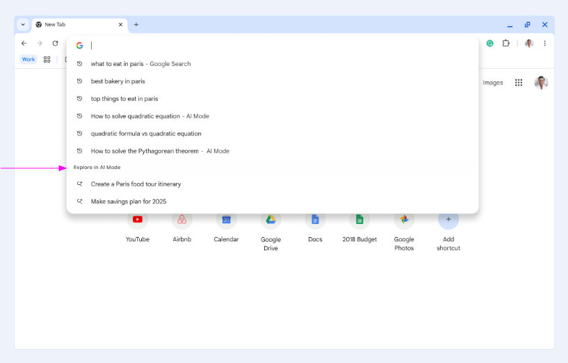 Google представила режим ИИ (AI Mode) для поисковых рекомендаций в Chrome 139. При клике на адресную строку или вводе запроса может появиться новый раздел — «Исследовать в режиме ИИ» (Explore in AI Mode). Он дополняет стандартные предложения Chrome, например, те, что основаны на совпадениях с закладками.