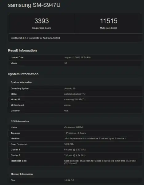 Тесты проводились на устройстве Samsung с модельным номером SM-S947U, предположительно Galaxy S26 Edge. Это указывает на возможное использование версии Snapdragon 8 Elite 2, оптимизированной специально для устройств Galaxy. В бенчмарке Geekbench 6.4 процессор показал результат 3393 балла в одноядерном тесте и 11515 баллов в многоядерном. По сравнению с прошлогодним Snapdragon 8 Elite, который набирал около 3125 и 9932 баллов соответственно, прирост одноядерной производительности составил около 9%.