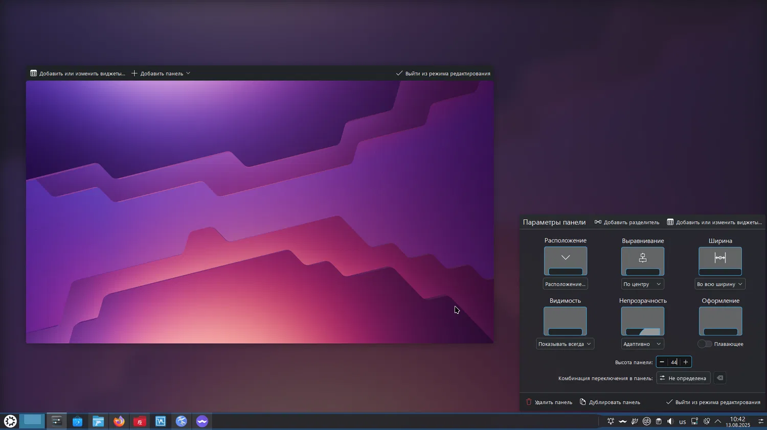 Пользователи могут настроить панель задач по своему вкусу: перемещать её на любой край экрана, добавлять или удалять виджеты. Для работы с несколькими мониторами KDE Plasma позволяет клонировать панель задач, сохраняя её настройки. При этом каждая панель остаётся независимой, что даёт гибкость в настройке под конкретные нужды.