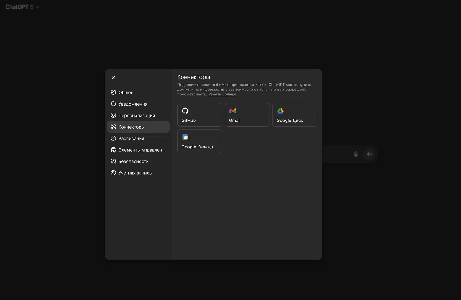 Коннекторы ChatGPT для тарифов Plus/Pro недоступны в странах Европейской экономической зоны (ЕЭЗ), Швейцарии и Великобритании. Пользователи ChatGPT Pro в других регионах могут включить интеграцию с Gmail, Google Календарь и Google Контакты, перейдя в Настройки > Коннекторы.