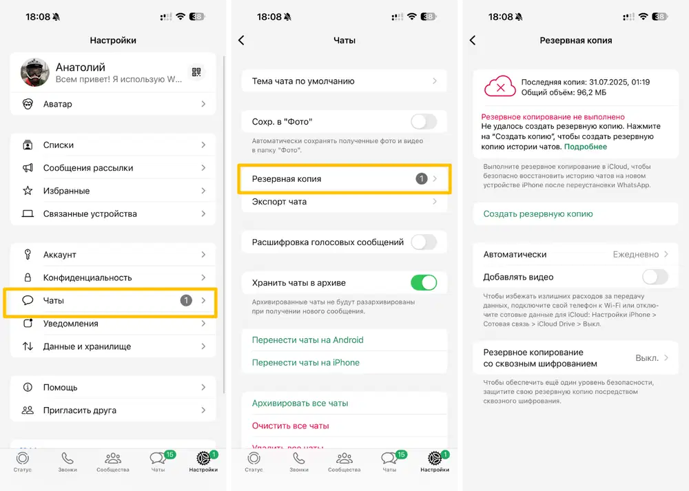 WhatsApp/Databases). Рекомендуется скопировать этот файл на компьютер или внешнее хранилище для надёжности. На iPhone резервная копия хранится в iCloud — при желании вы можете сделать полную резервную копию iPhone через iTunes на компьютере, чтобы иметь локальный файл с данными WhatsApp.