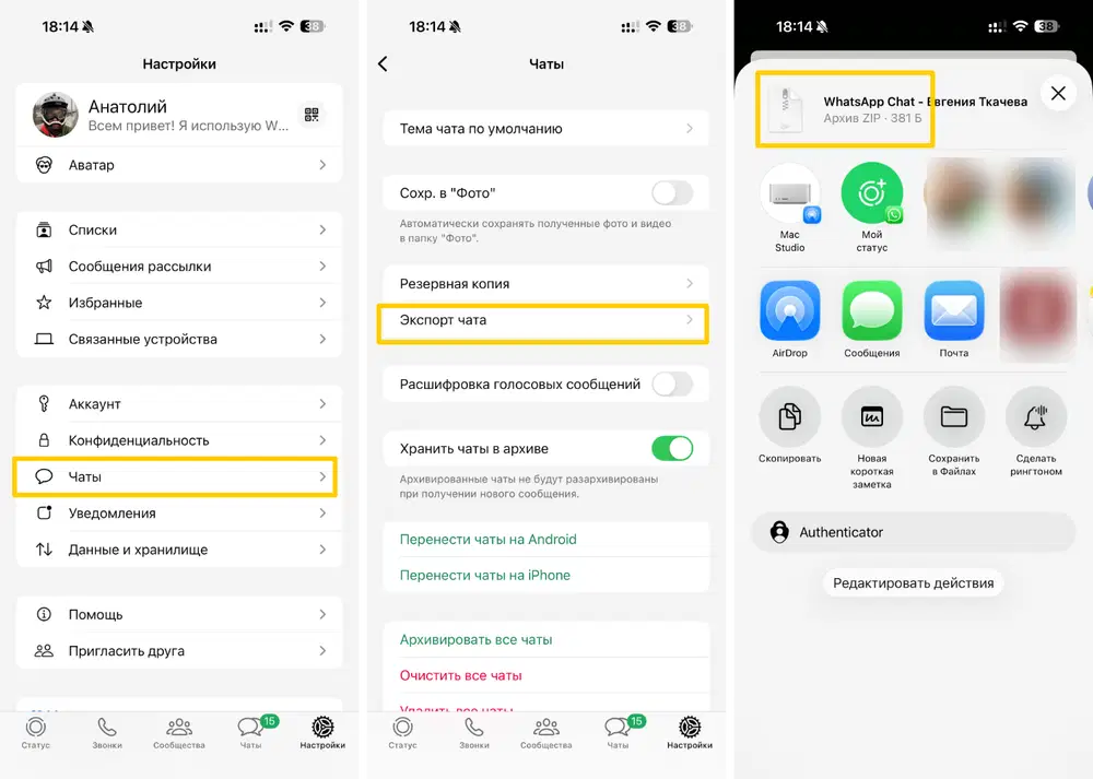 Экспорт переписок и медиафайлов из WhatsApp