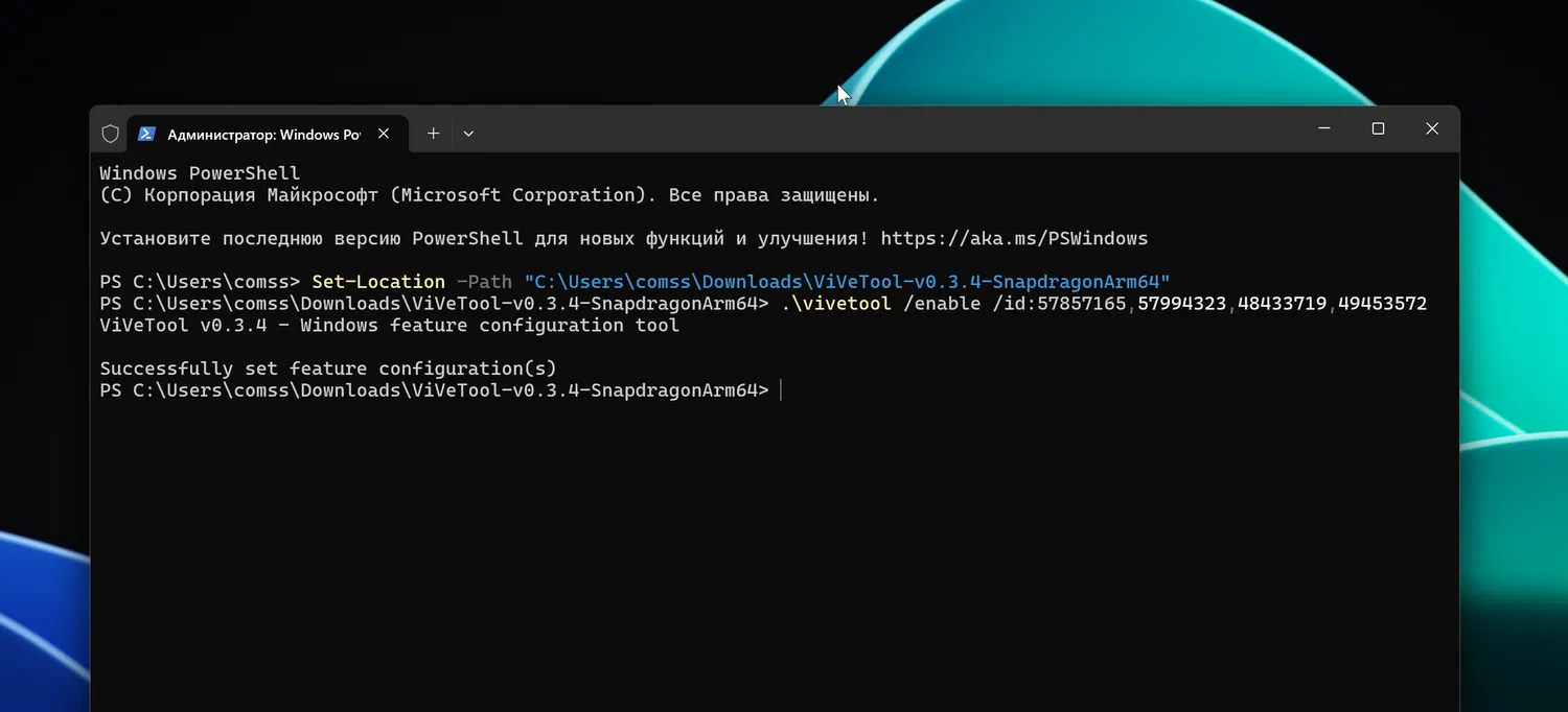 Примечание: В примерах выше используется Терминал Windows с профилем PowerShell. Если вы используете профиль Командная строка, замените начало команды .\vivetool на vivetool.