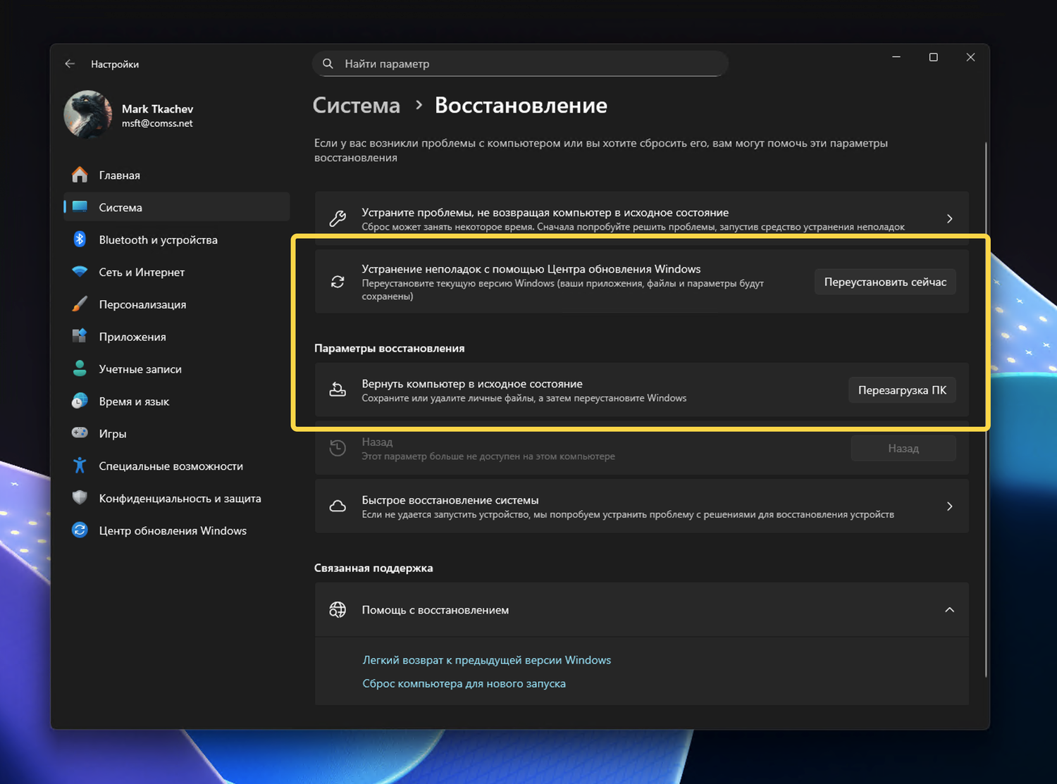 Если попытаться сбросить или восстановить устройство с более старой (но все еще поддерживаемой) версией Windows 10 или Windows 11, процесс завершится сбоем. Запустить эту функцию можно разными способами: через Система > Восстановление > Вернуть компьютер в исходное состояние или через Система > Восстановление >Устранение неполадок с помощью Центра обновления Windows, либо с помощью RemoteWipe CSP. Все эти методы не работают на затронутых платформах.