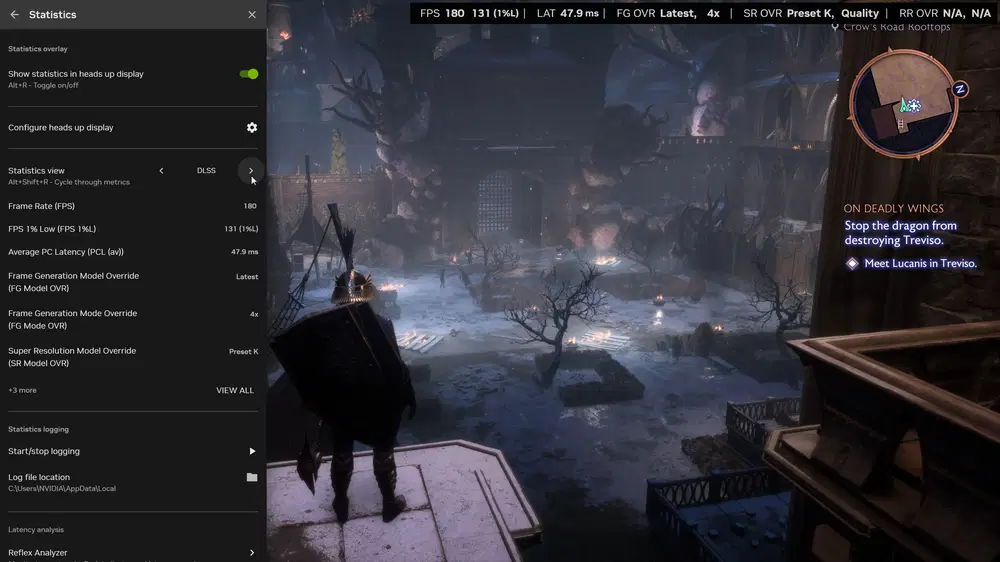 Более того, NVIDIA добавила мониторинг статуса DLSS-улучшений прямо в игру: в оверлее статистики (вызывается Alt+Z) появился раздел DLSS, где отображается активный режим DLSS и применение глобальных настроек; отображение можно переключать сочетанием Alt+R. Таким образом, игрок всегда видит, работает ли принудительный DLSS-режим в данный момент.