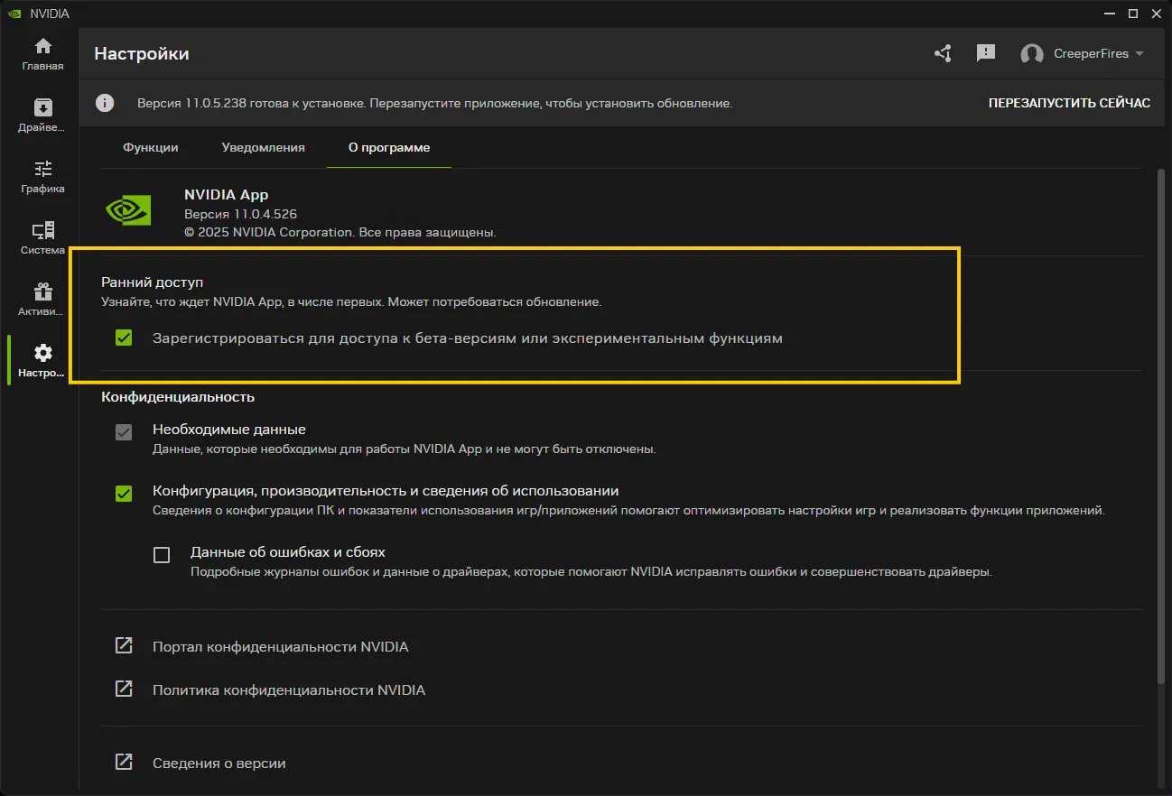 Новые возможности будут доступны в бета-версии Приложения NVIDIA с 19 августа в 19:00 по московскому времени (9 AM PT). Участники бета-программы могут обновить приложение через меню Настройки > О программе > Ранний доступ (опция Зарегистрироваться для доступа к бета-версиями или экспериментальным функциям), параллельно установив свежий драйвер Game Ready – 581.08 WHQL, необходимый для работы ряда функций.